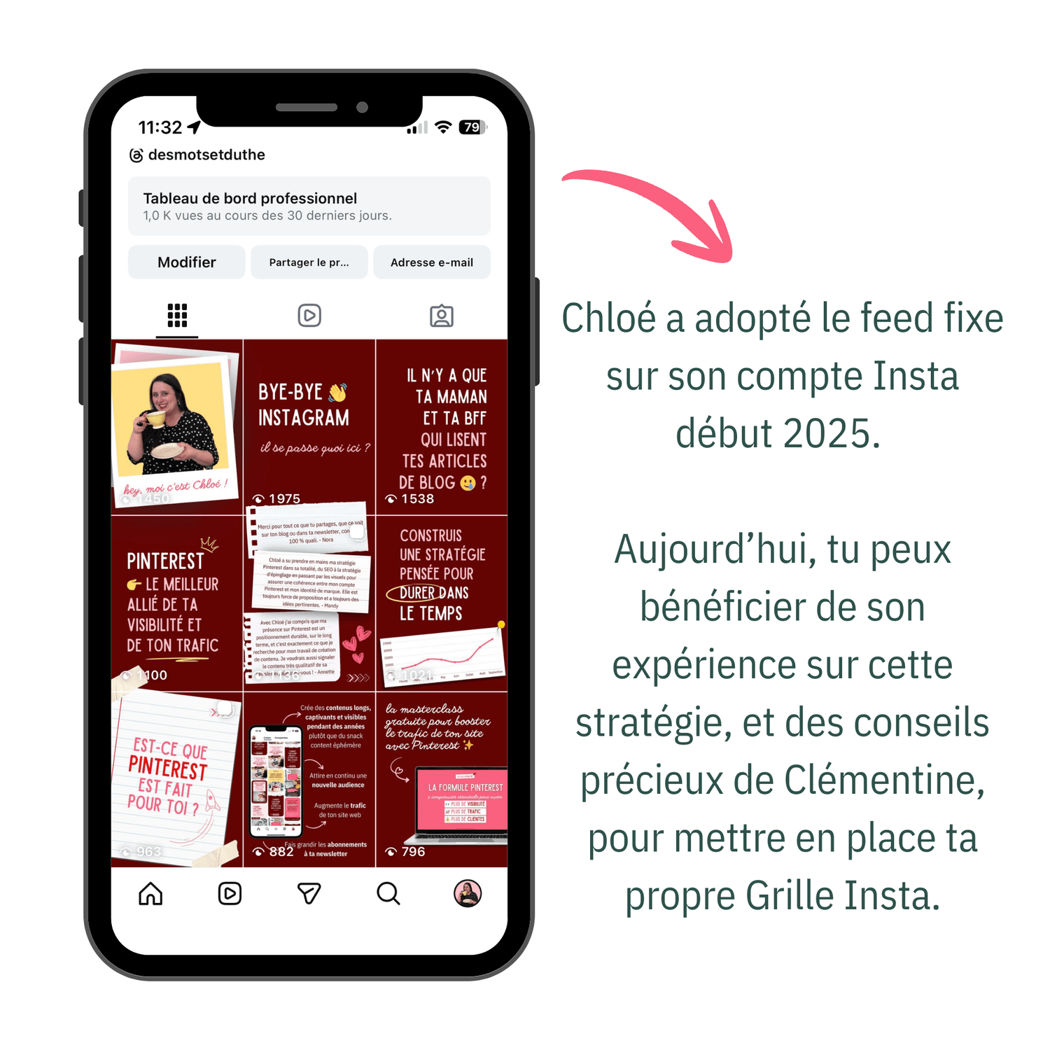 🐚 Chloé est experte Pinterest. Au printemps 2025, après un gros ras-le-bol d'Instagram, elle a adopté le feed fixe. Son expérience t'aidera à anticiper les questionnements que tu pourrais avoir et à avancer sereinement. Découvre son feed fixe sur Insta.